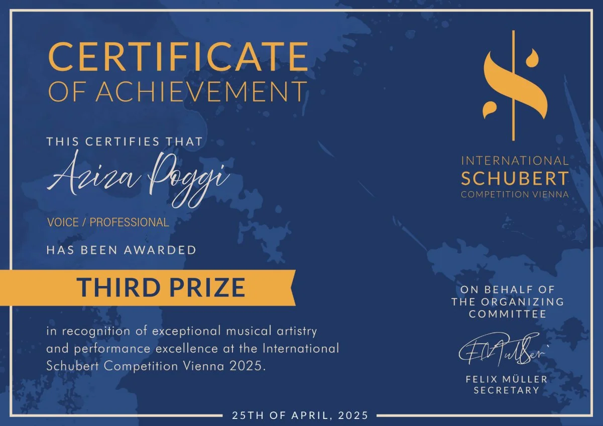 Aziza has won third place in the professional category for the USA in the International Schubert Competition Vienna in April of 2025.