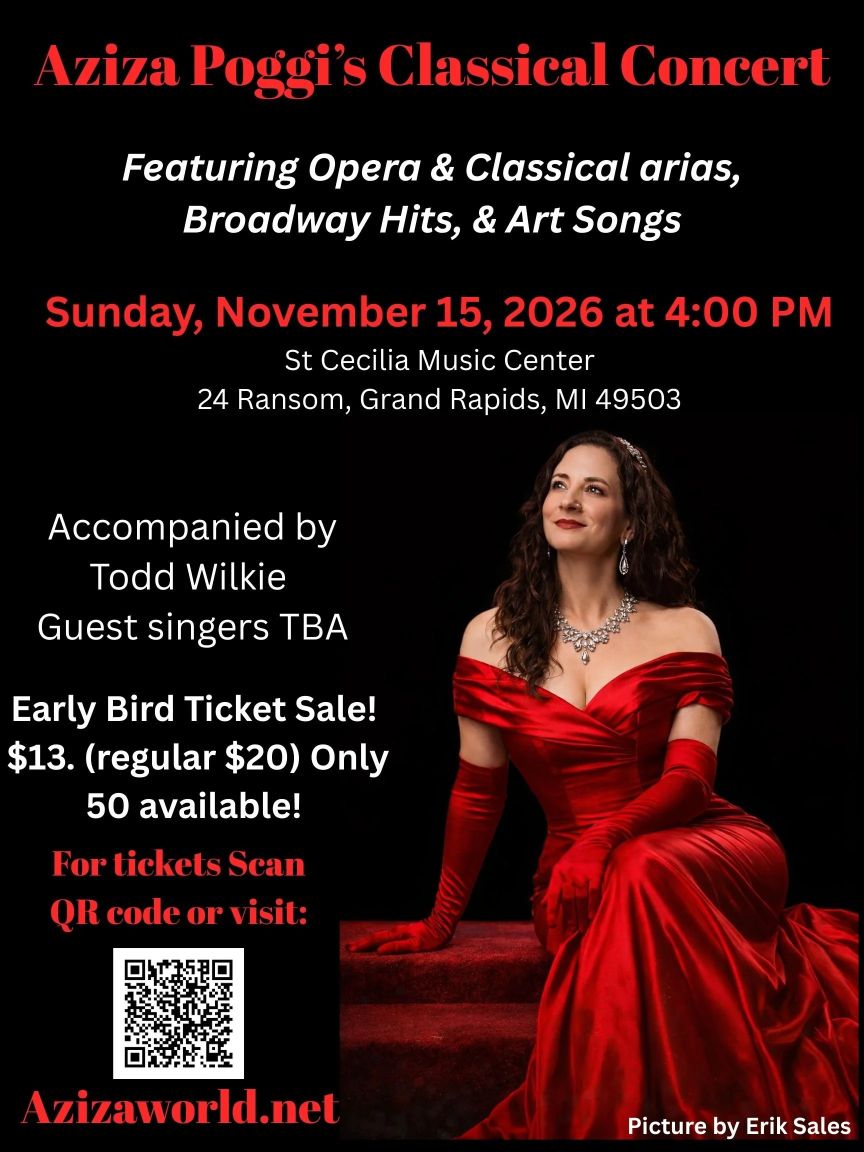Aziza Poggi’s Classical Concert November 15, 2026, 4:00 PM St. Cecilia Music Center, 24 Ransom Ave, Grand Rapids, MI 49503 Details and Early Bird Tickets now available! Click picture or here for tickets.