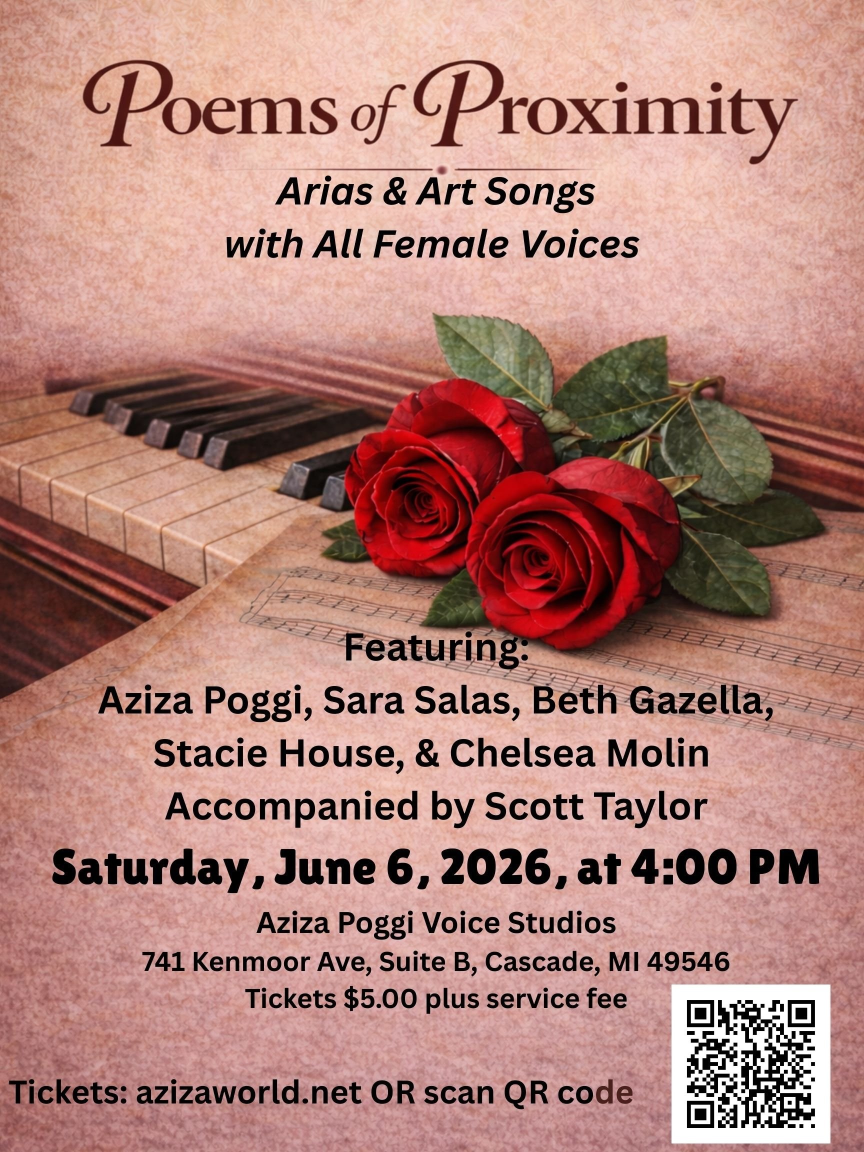 Poems of Proximity Saturday, June 6, 2026, 4:00 PM Aziza Poggi Voice Studios, 741 Kenmoor Ave Suite B, Cascade, MI 49546